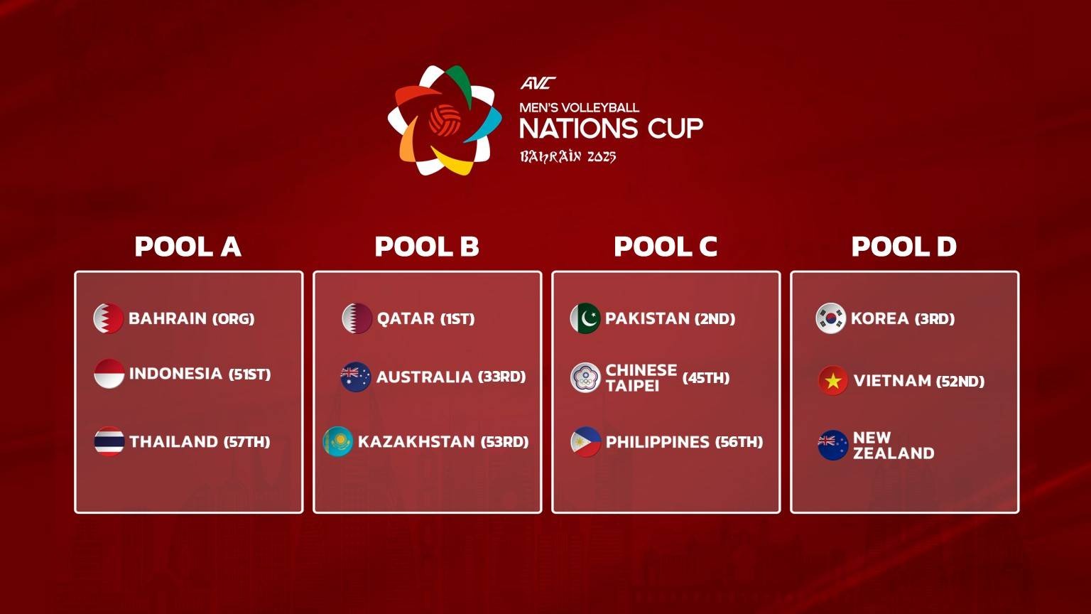 مسابقات گروه مردان این رقابتها نیز قرعه کشی شد که به دلیل حضور ایران در لیگ ملتهای جهان، نیاز به حضور نماینده مردان والیبال ایران نیست، اما گروه بندی جام ملتهای مردان آسیا به قرار زیر است: