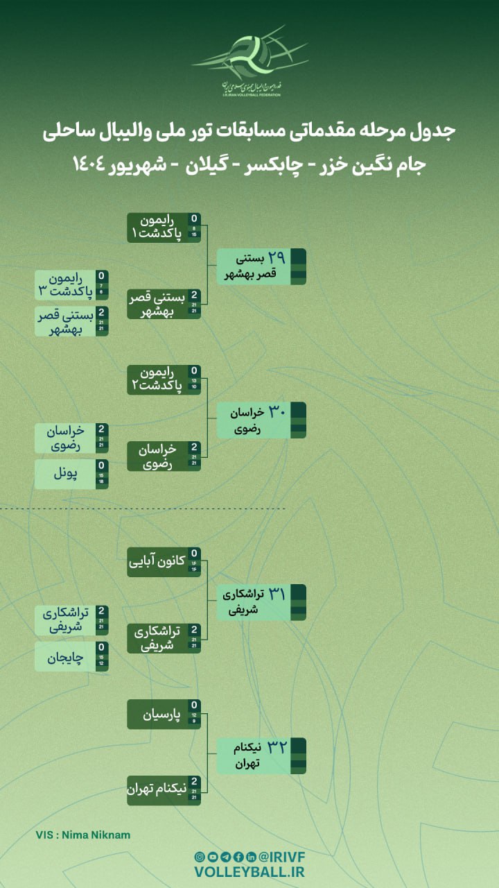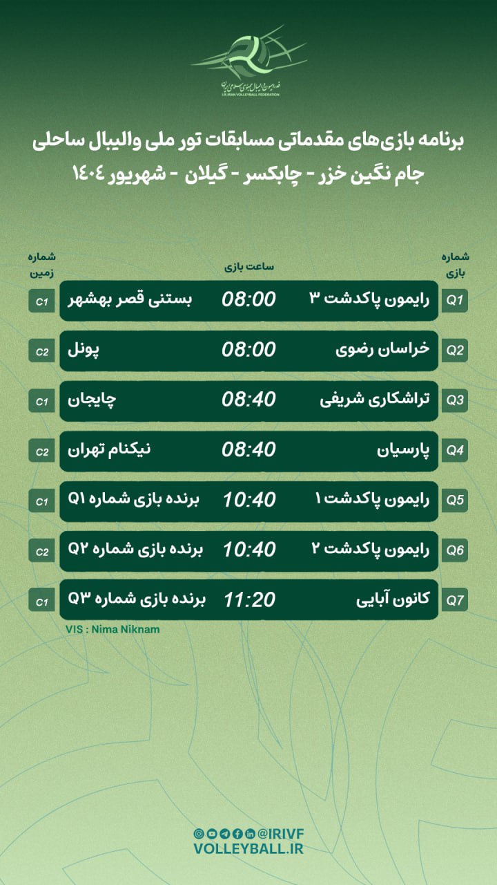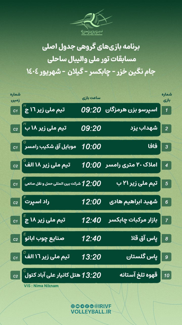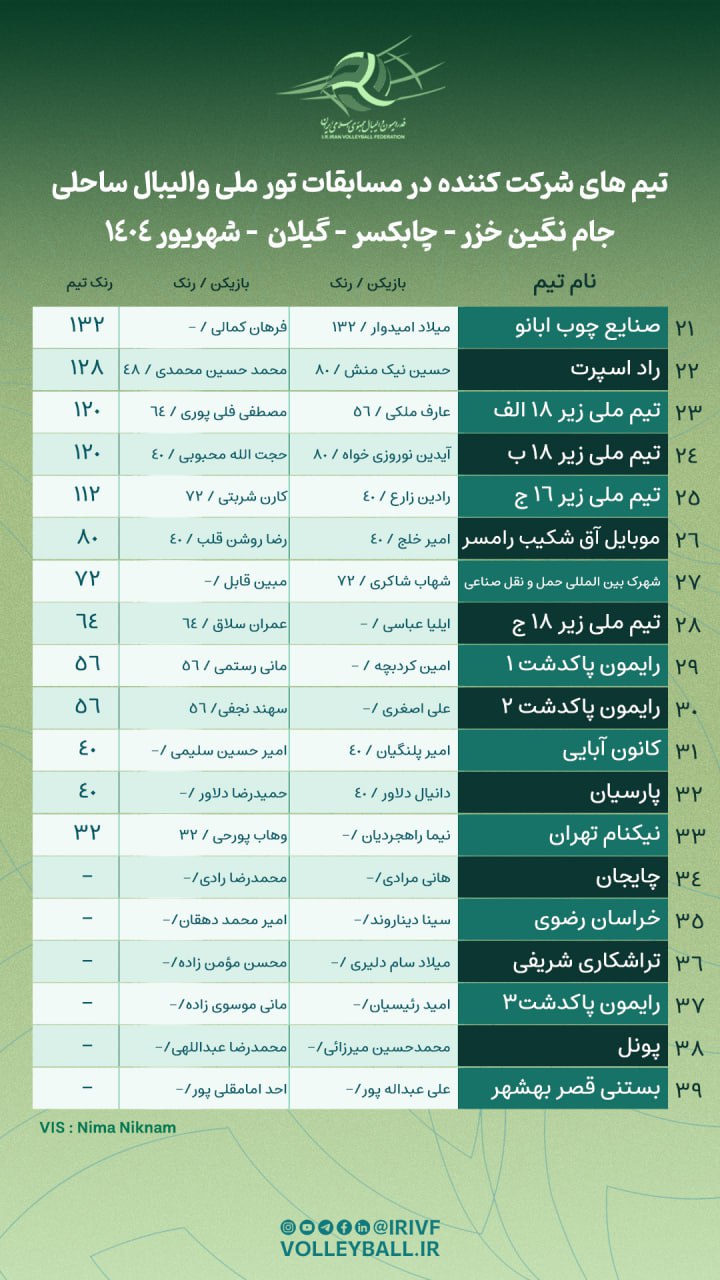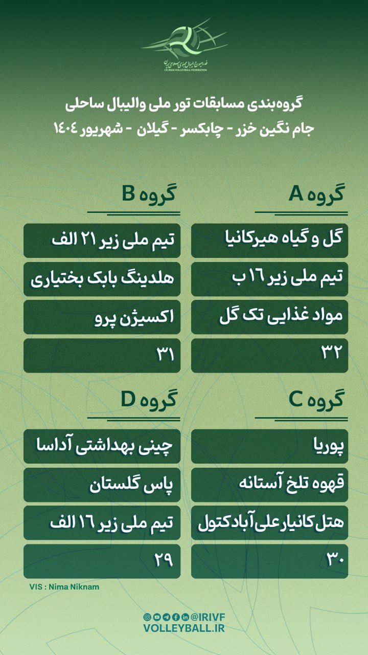 به گزارش دپارتمان ارتباطات فدراسیون والیبال، تور ملی والیبال ساحلی رده سنی آزاد نگین خزر با همکاری هیات والیبال استان گیلان و بر اساس قوانین فدراسیون جهانی از ۲۵ تا ۲۷ شهریورماه پیگیری خواهد شد. این رقابتها با حضور ۳۹ تیم از جمله هشت تیم ملی ردهسنی کشور در چابکسر آغاز شد که رکورد استقبال فراوانی از این مسابقات را نشان میدهد.