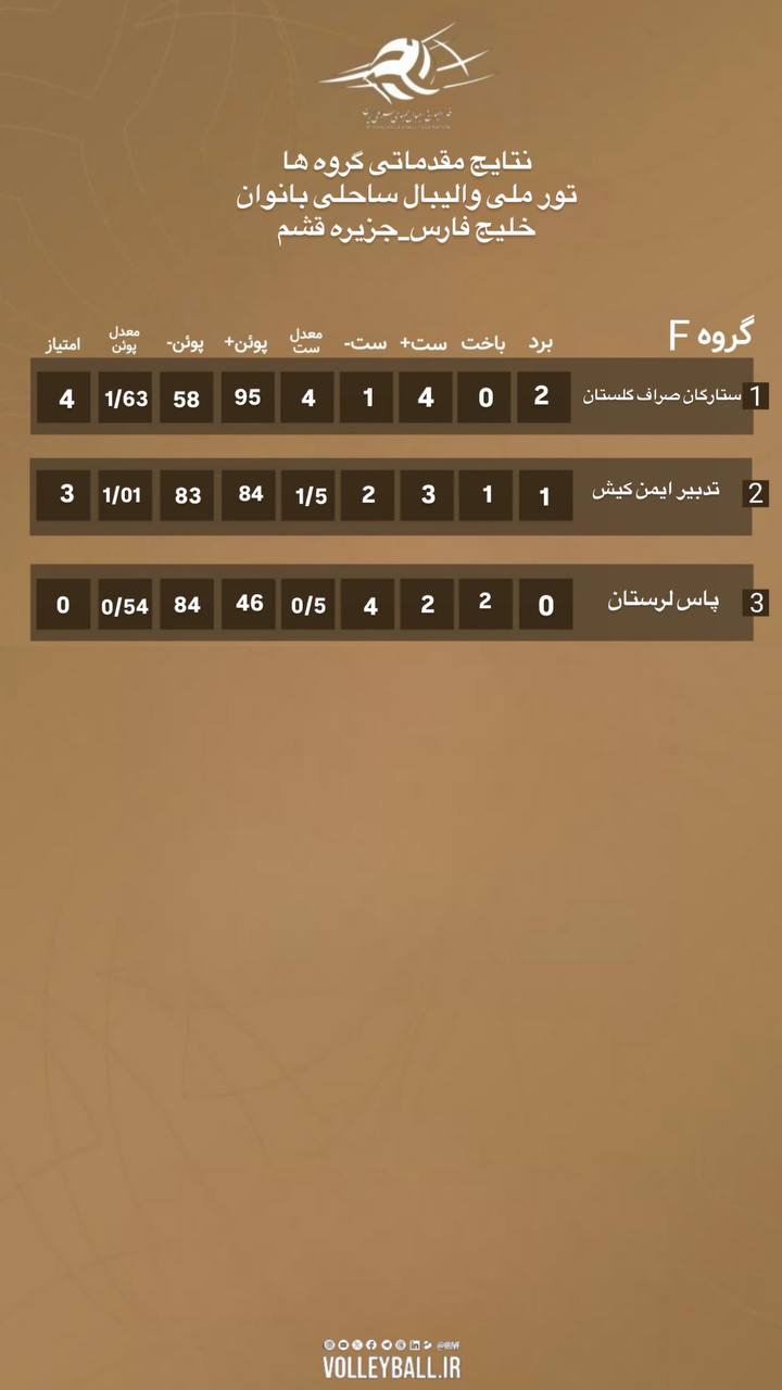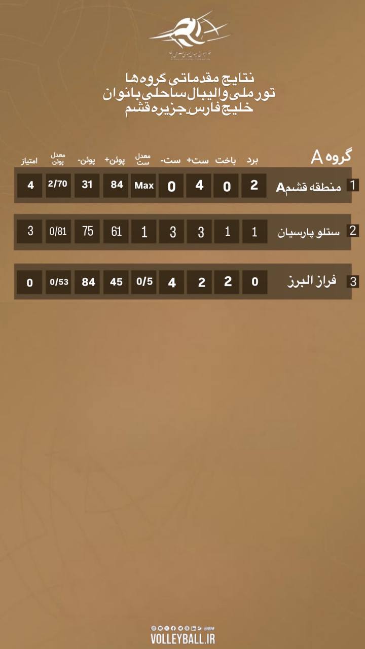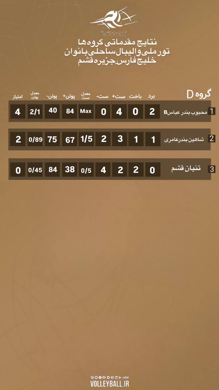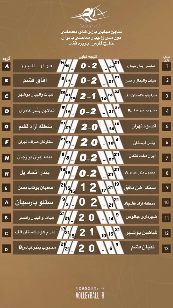 مرحله مقدماتی تور ملی والیبال ساحلی زنان جام «خلیج فارس» با معرفی ۱۶ تیم مرحله حذفی به پایان رسید.