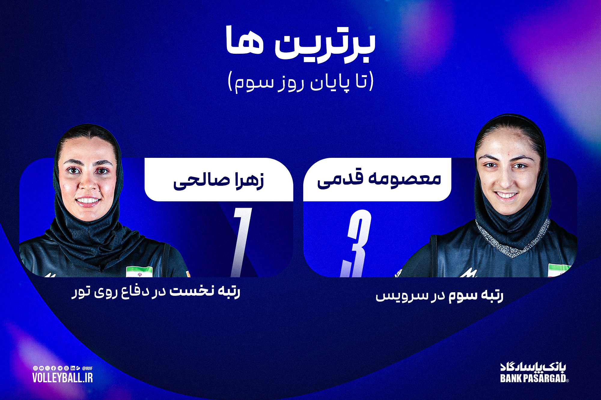 دو ملی پوش والیبال زنان ایران بر اساس اعلام سایت والیبال ورلد در فهرست بهترین بازیکنان جام ملتهای آسیا ۲۰۲۵ تا پایان دیدارهای روز سوم معرفی شدند.