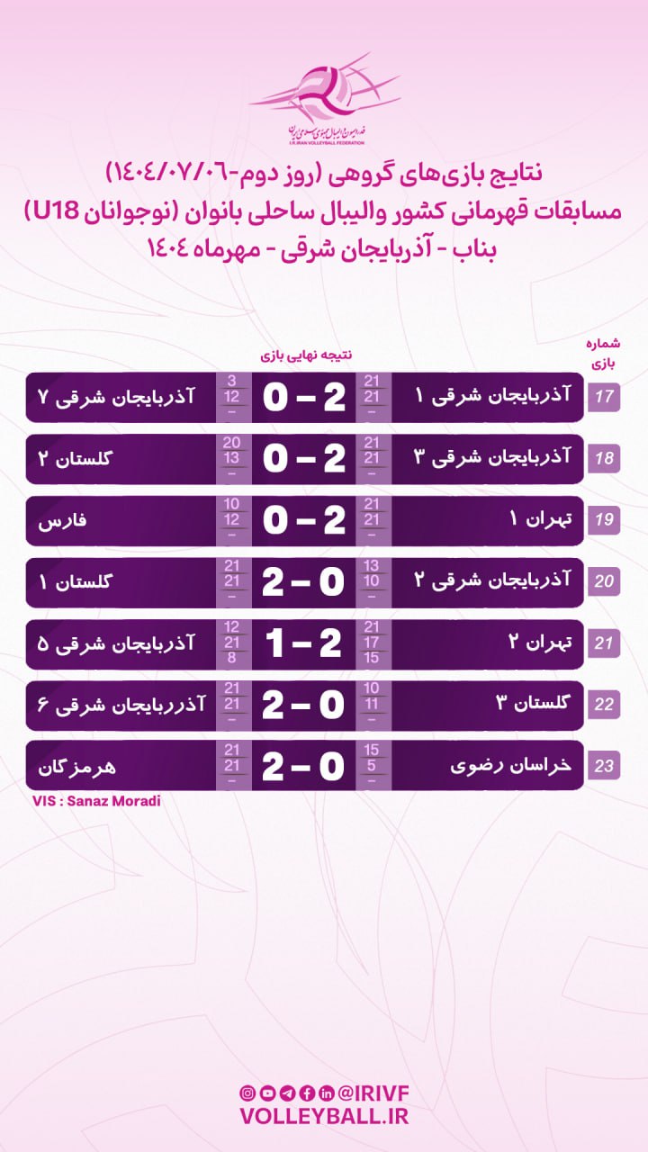 مرحله مقدماتی مسابقات والیبال ساحلی قهرمانی زیر ۱۸ سال دختر کشور با معرفی هشت تیم صعود کننده به مرحله حذفی به پایان رسید.