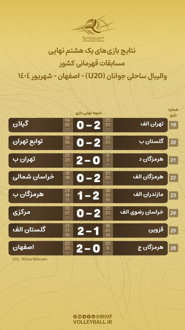 مسابقات والیبال ساحلی قهرمانی زیر ۲۰ سال کشور با معرفی هشت تیم برتر پیگیری شد.