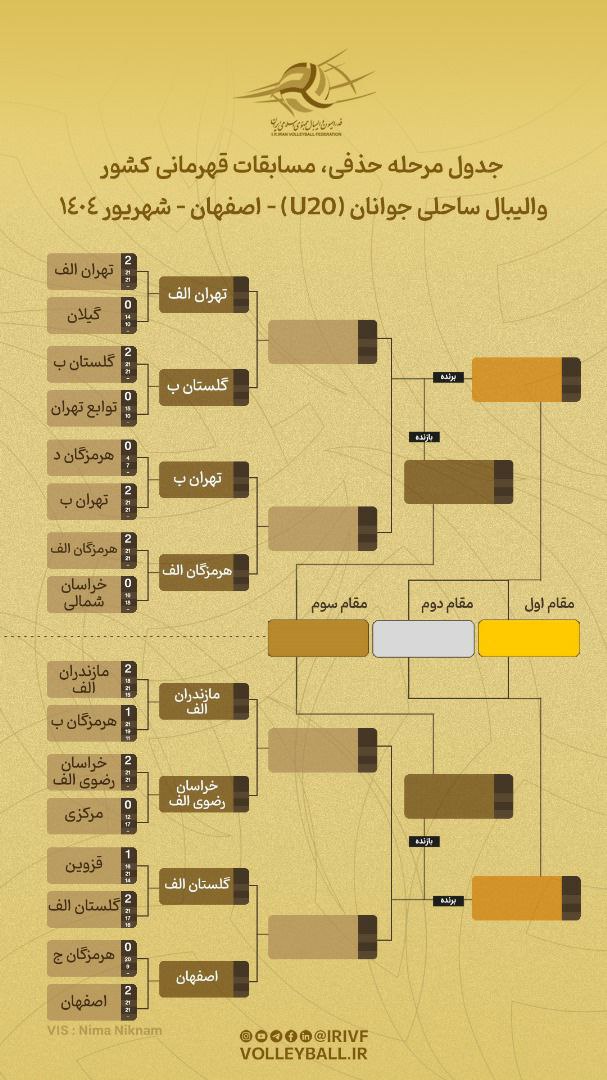 تیمهای تهران الف و ب، گلستان الف و ب، هرمزگان الف، مازندران الف، خراسان رضوی الف و اصفهان به مرحله یک چهارم نهایی این رقابتها صعود کردند.