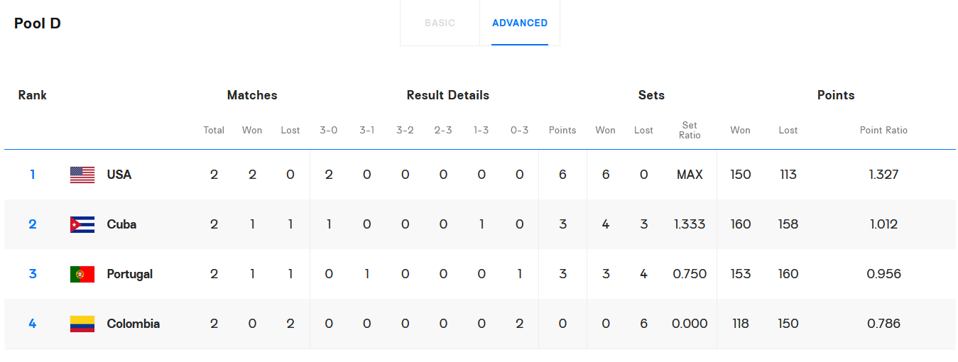 آمریکا ۳ – پرتغال صفر (۲۵ بر ۱۹، ۲۵ بر ۲۲ و ۲۵ بر ۱۷)