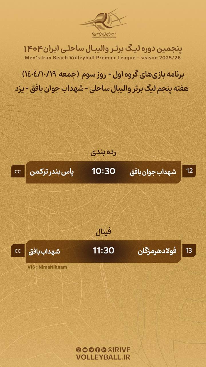 برنامه دیدارهای ردهبندی و فینال این هفته لیگ برتر ساحلی که فردا (جمعه 19 دی) برگزار میشود به قرار زیر است: